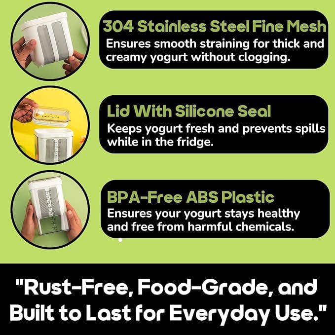 Crafted from a crystal-clear PET canister and rust-resistant stainless steel. Ensures your homemade dairy is free from preservatives, chemicals, and additives.